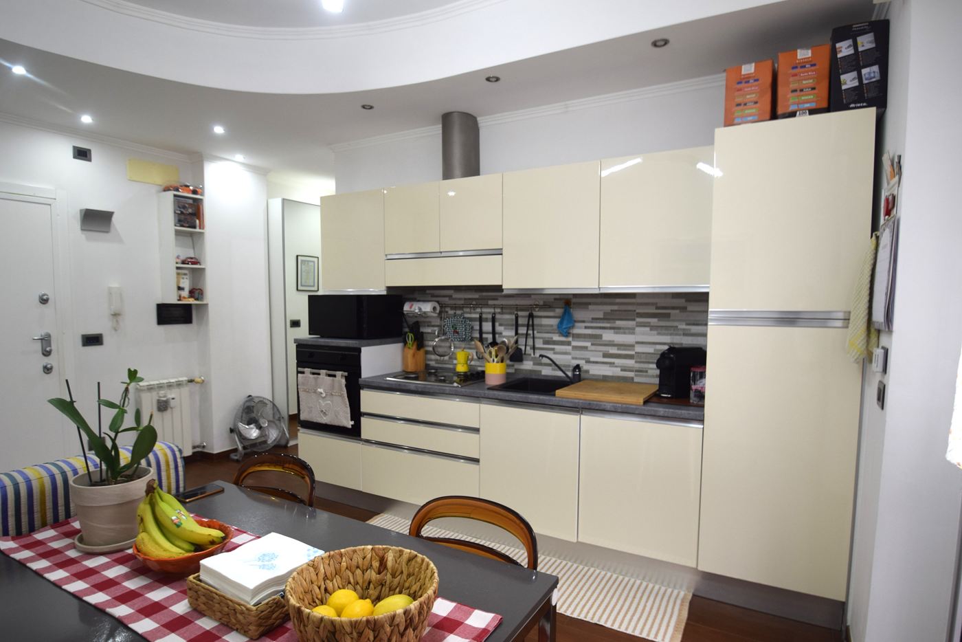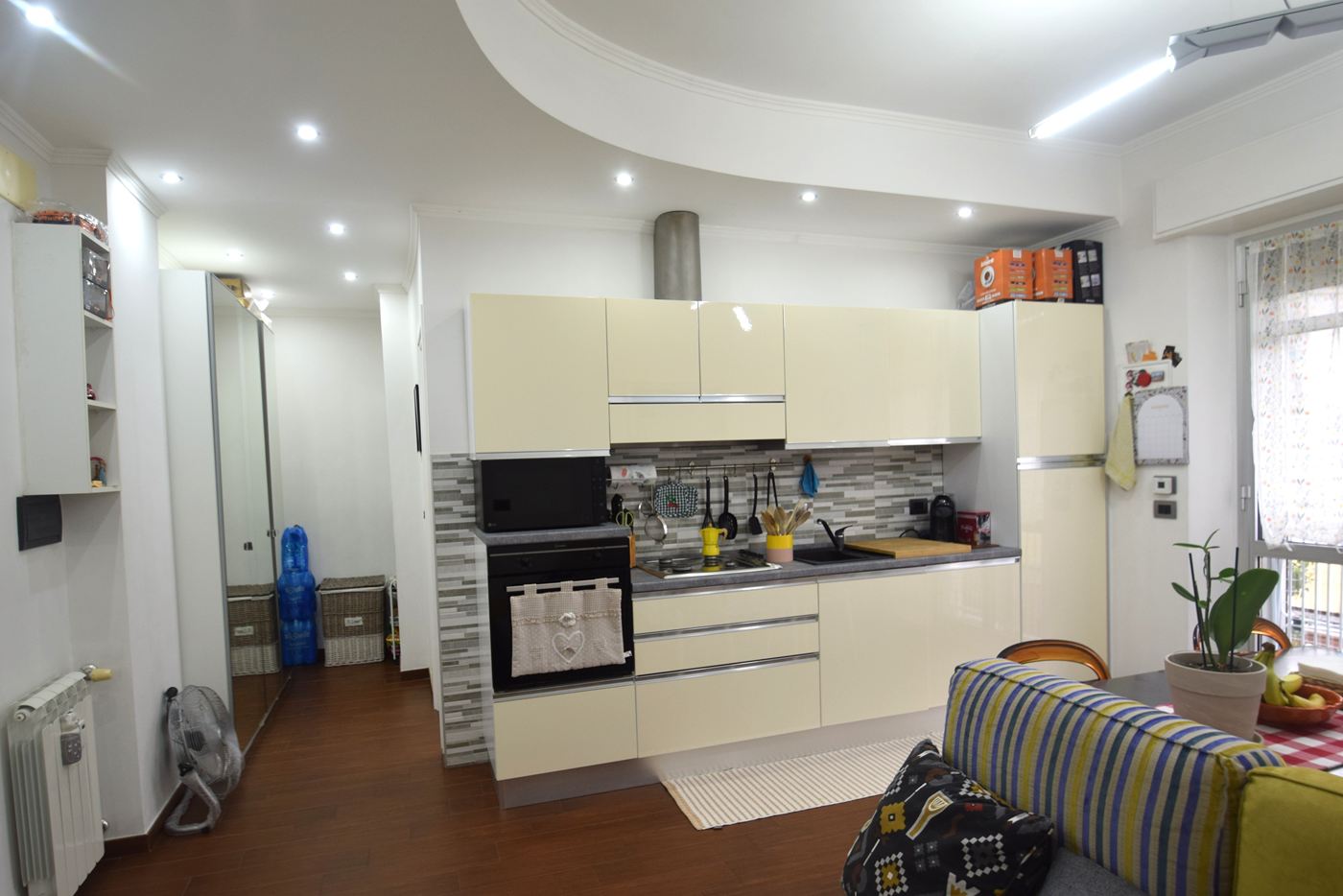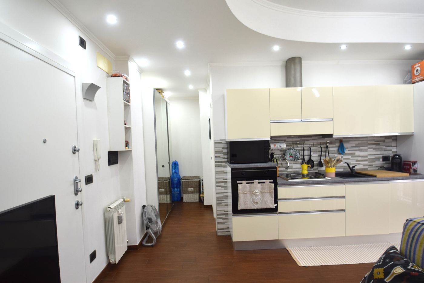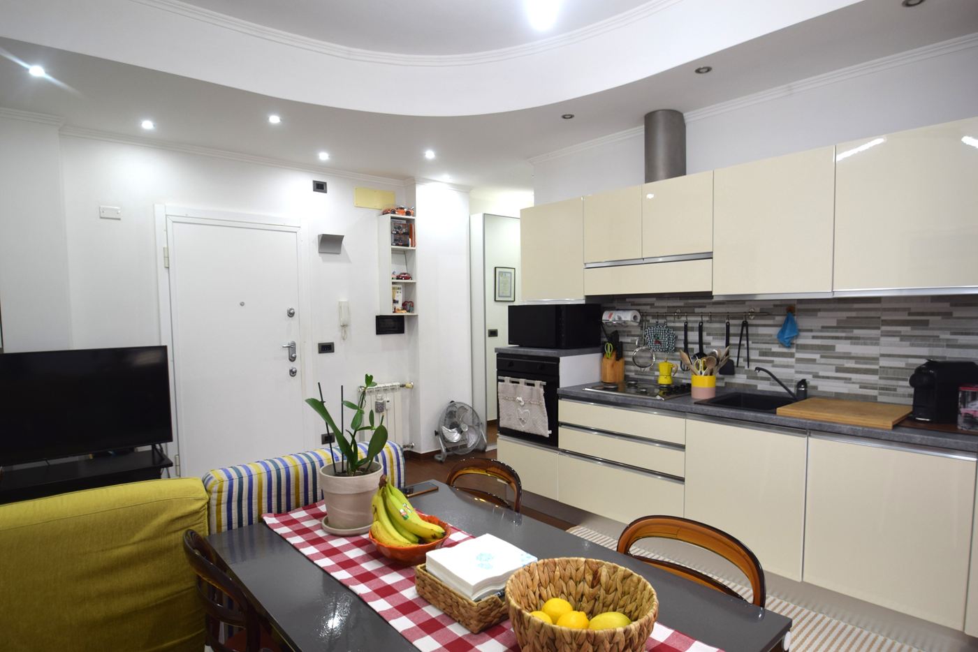 4 vani ristrutturati posti al penultimo piano di un condominio con ascensore composti da: Ingresso openspace con divano e tv frontale, cucina con tavolo e sedie con portafinestra che permette l'accesso al balcone vivibile con tenda da sole; camera matrimoniale con lampada led a soffitto corredata da pale comandate con telecomando, 1 bagno con doccia e un armadio a vetri di fronte all'ingresso del bagno uso dispensa. Gli infissi sono in Pvc con doppi vetri, le tapparelle sono in plastica ( quella del bagno elettrica), porta blindata, illuminazione con faretti sia in ingresso che sopra alla cucina, parcheggio con sbarra riservato ai tre civici del complesso. L'appartamento si trova in una zona centrale di Prà raggiungibile a piedi attraverso il parcheggio di via Cordanieri (ex Elah), vicino a negozi. stazione ferroviaria, autobus e a tutti i servizi. I mobili sono compresi nel prezzo.