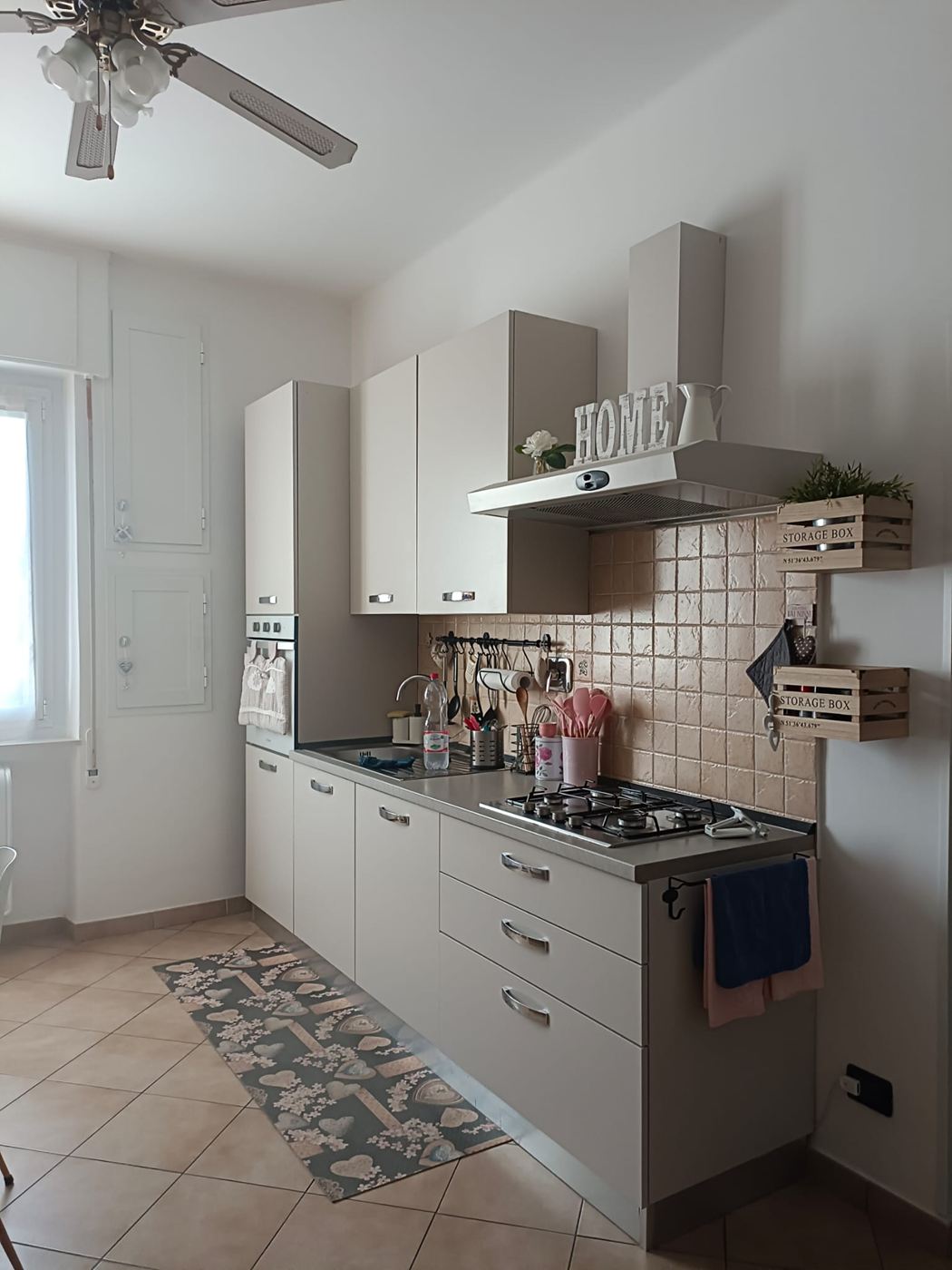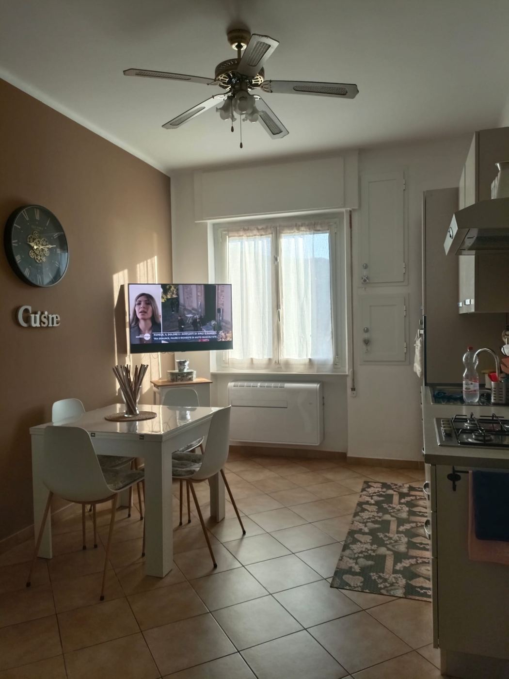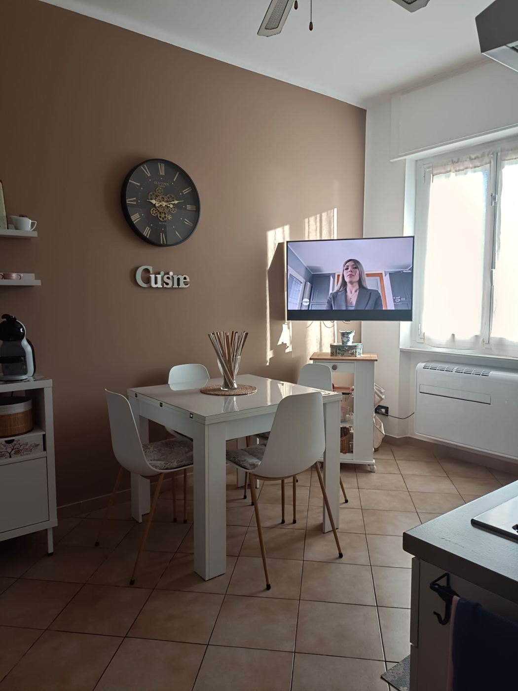 4 vani ristrutturati posti al penultimo piano di un condominio con ascensore composti da: Ingresso openspace con divano e tv frontale, cucina con tavolo e sedie con portafinestra che permette